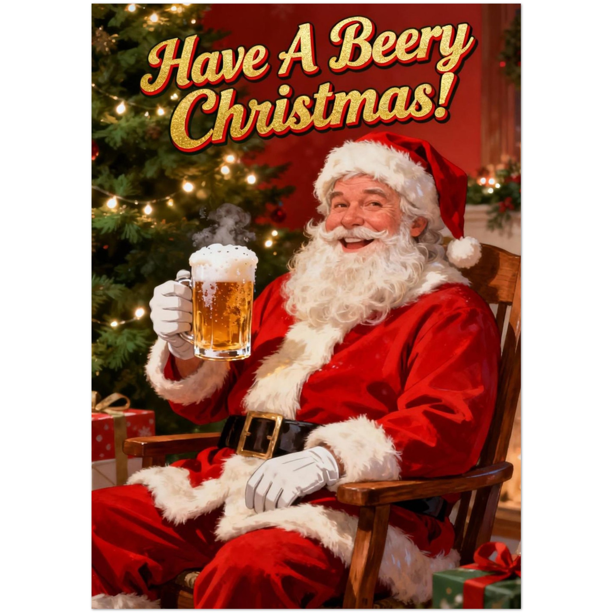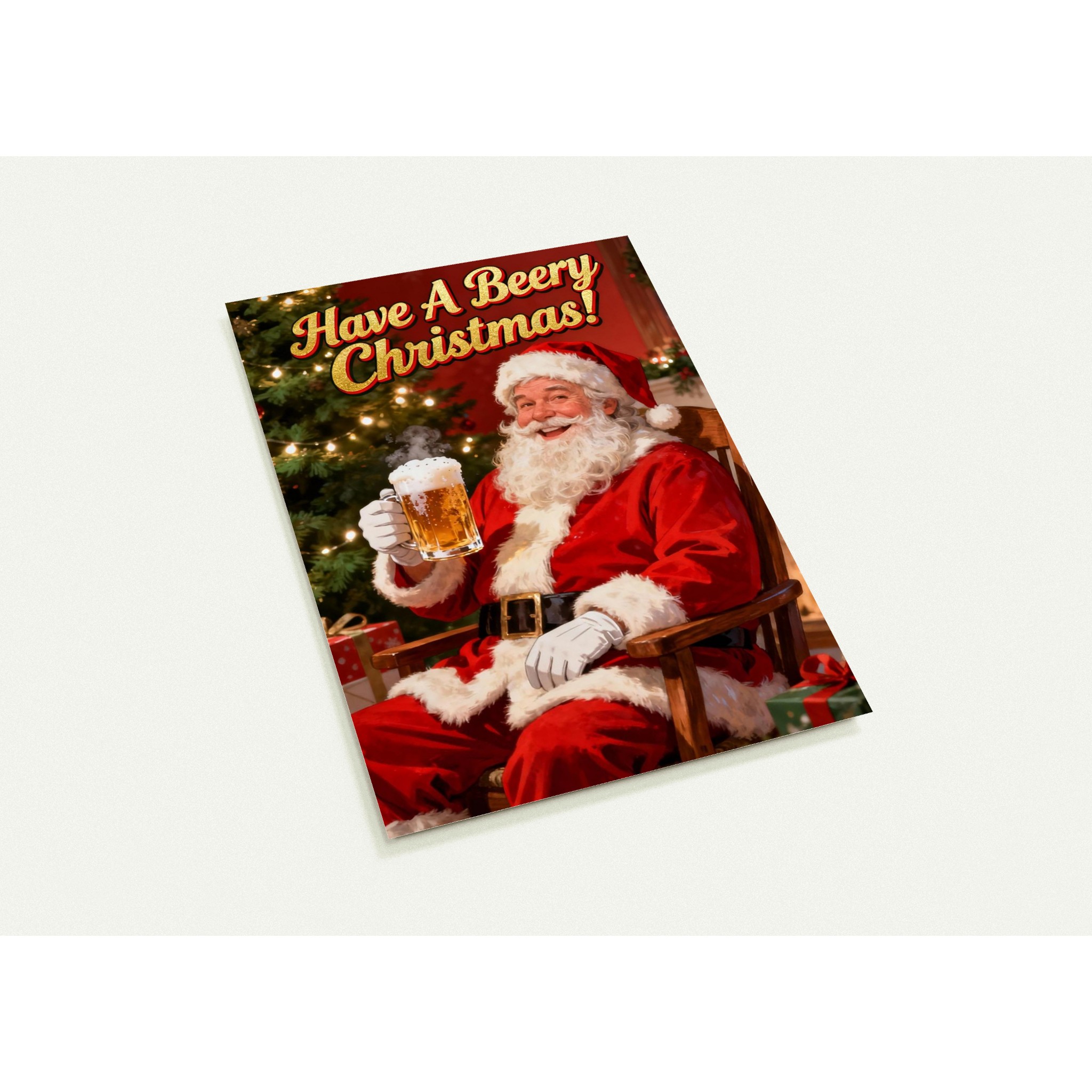 Det här är julkorten som garanterat får mottagaren att dra på smilbanden! På framsidan syns en glad tomte med en välförtjänt öl och texten “Have a Beery Christmas!”. På baksidan fortsätter skratten med rimmet: